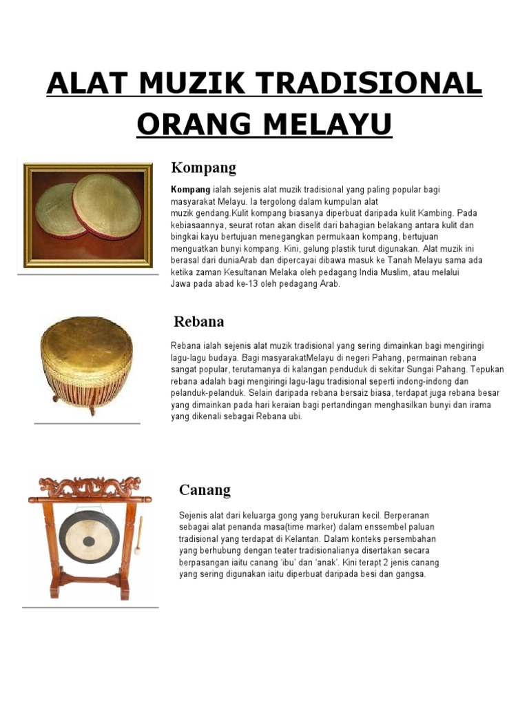 Berikut merupakan alat-alat muzik tradisional orang Melayu kecuali answer choices kompang rebana canang piano Question 2 30 seconds Report an issue Q. Malaysia merupakan negara yang sangat merangkumi alat muzik tradisional dan temporari. Berikut merupakan alat-alat muzik tradisional orang Melayu kecuali answer choices gedombak tabla gambus kompang Question 3 30 seconds Report an issue Q.